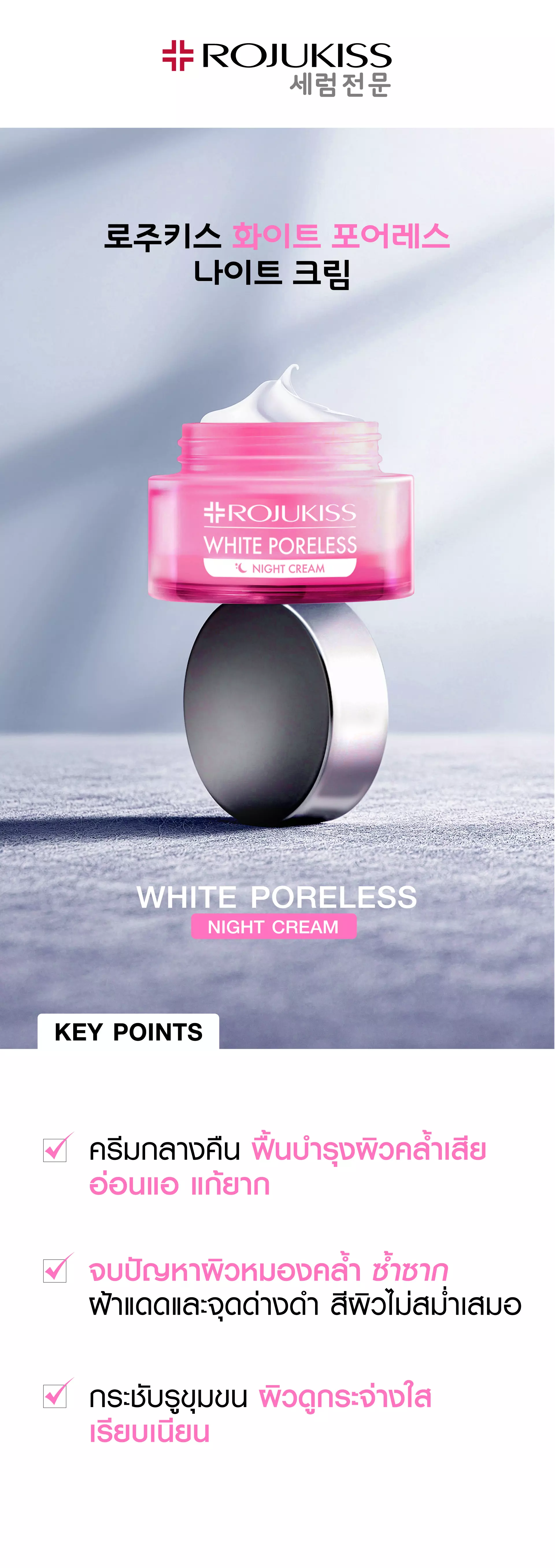 ROJUKISS WHITE PORELESS NIGHT CREAM a night cream that helps restore skin radiance, reduce the appearance of dark spots, tighten pores, even out skin tone, and leave the skin smooth.