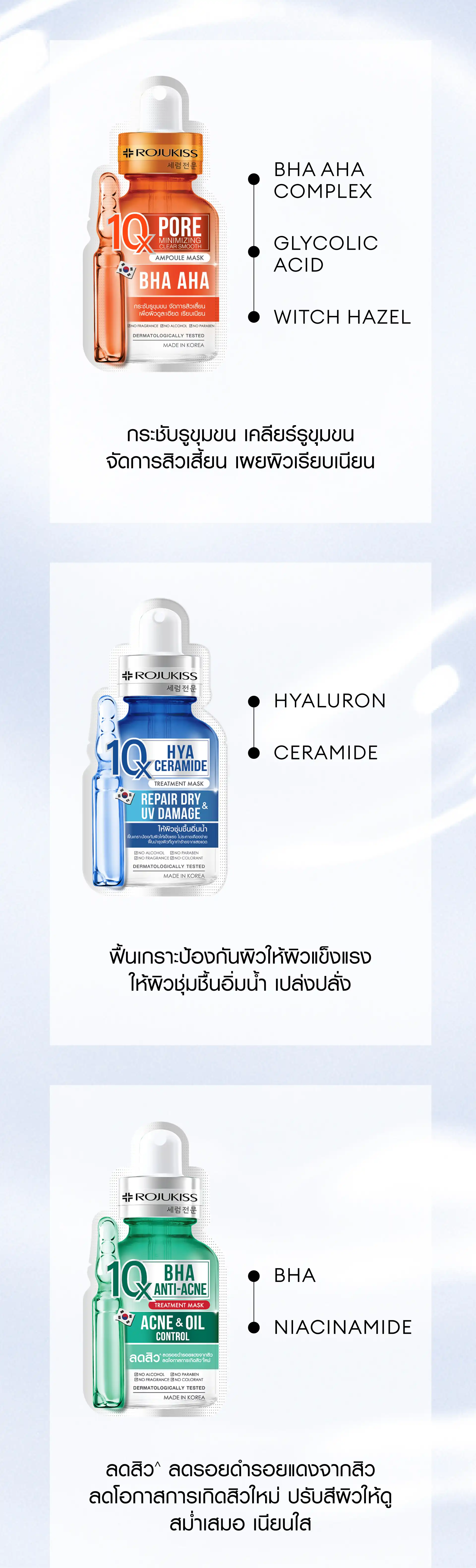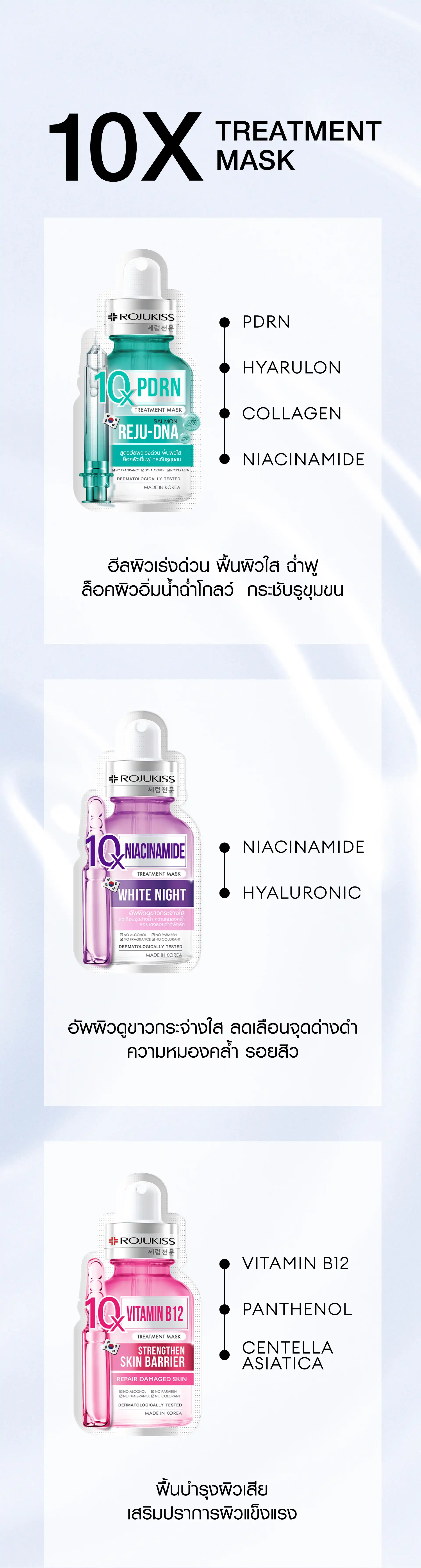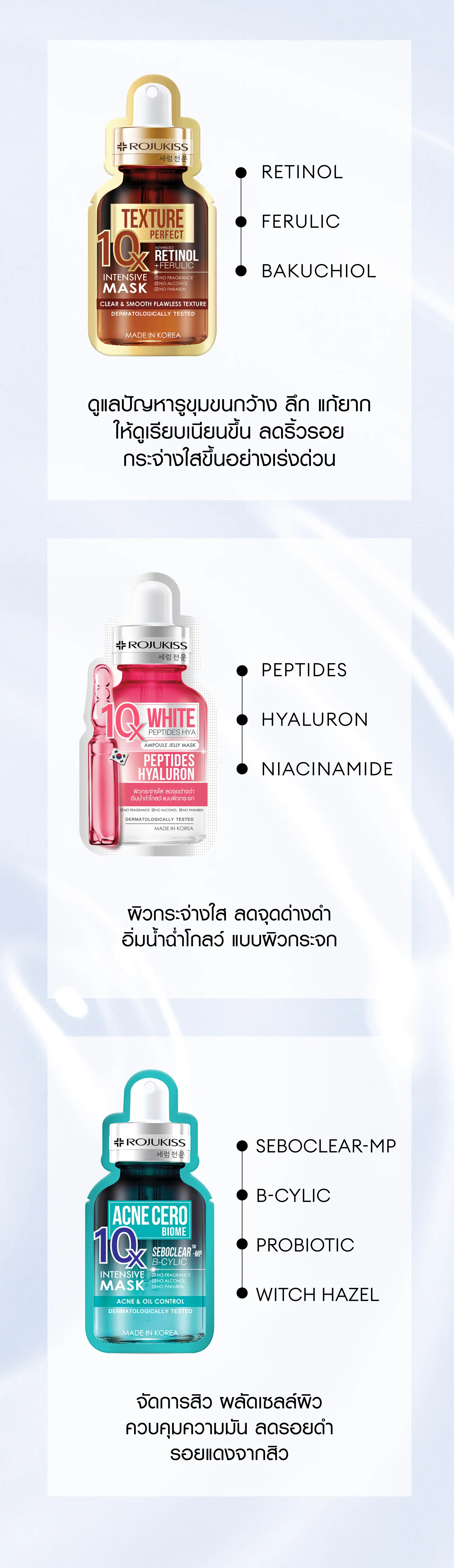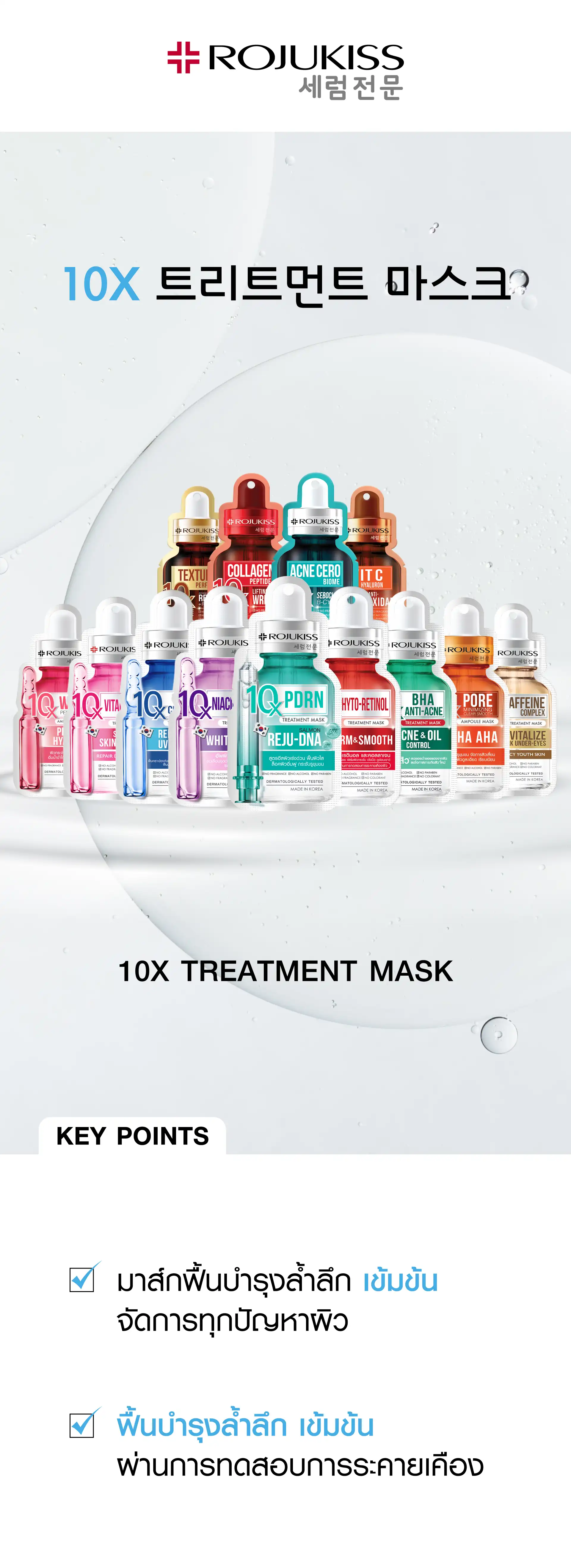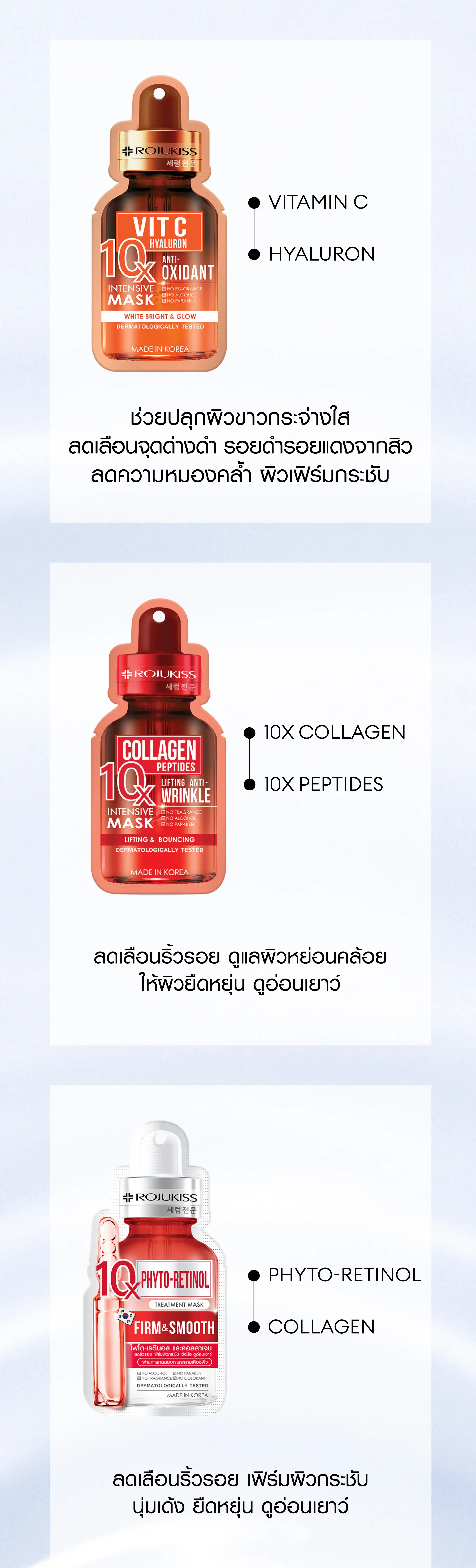 | ข้อมูลผลิตภัณฑ์ | ROJUKISS PDRN 10X TREATMENT MASK ROJUKISS NIACINAMIDE 10X TREATMENT MASK ROJUKISS VITAMIN B12 10X TREATMENT MASK ROJUKISS CAFFEINE COMPLEX 10X TREATMENT MASK ROJUKISS VIT C ANTI-OXIDANT 10X INTENSIVE MASK ROJUKISS COLLAGEN 10X INTENSIVE MASK ROJUKISS PHYTO-RETINOL 10X TREATMENT MASK ROJUKISS PORE MINIMIZING CLEAR SMOOTH 10X AMPOULE MASK ROJUKISS HYA CERAMIDE 10X TREATMENT MASK ROJUKISS BHA ANTI-ACNE 10X TREATMENT MASK ROJUKISS PERFECT TEXTURE 10X INTENSIVE MASK ROJUKISS WHITE PEPTIDES HYA 10X AMPOULE JELLY MASK ROJUKISS ACNE CERO BIOME 10X INTENSIVE MASK |