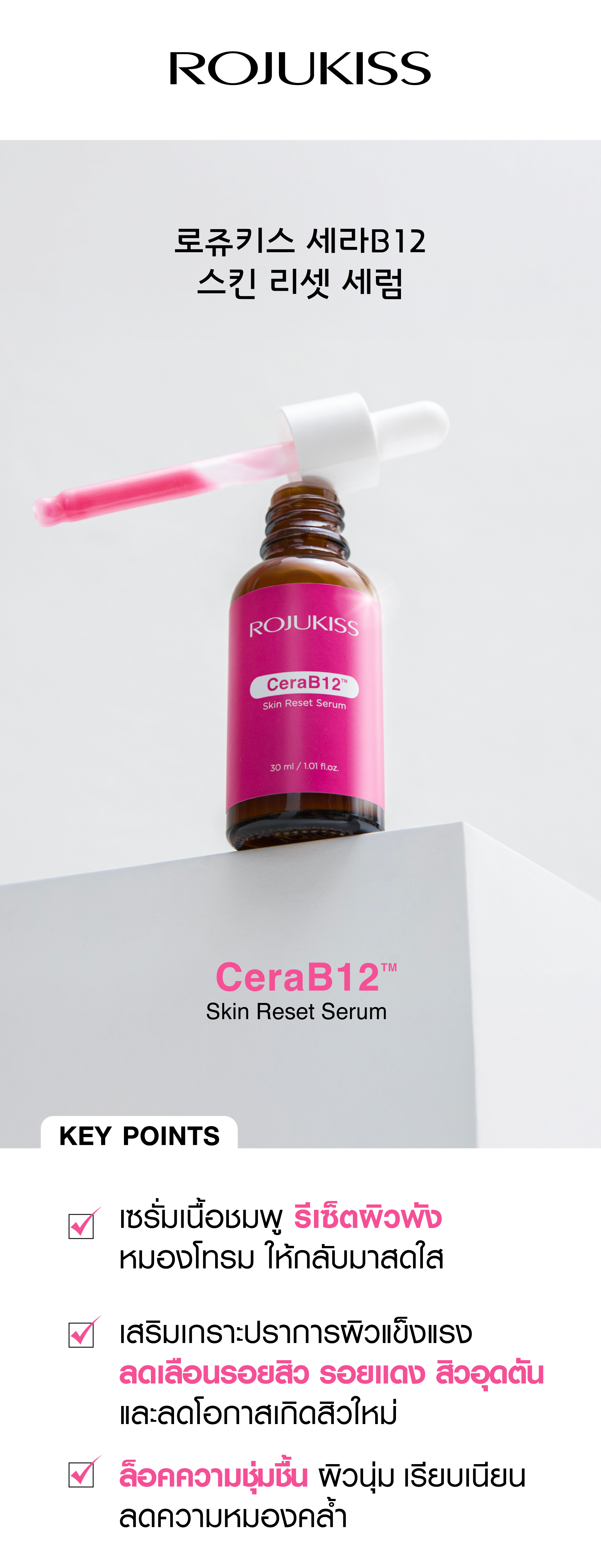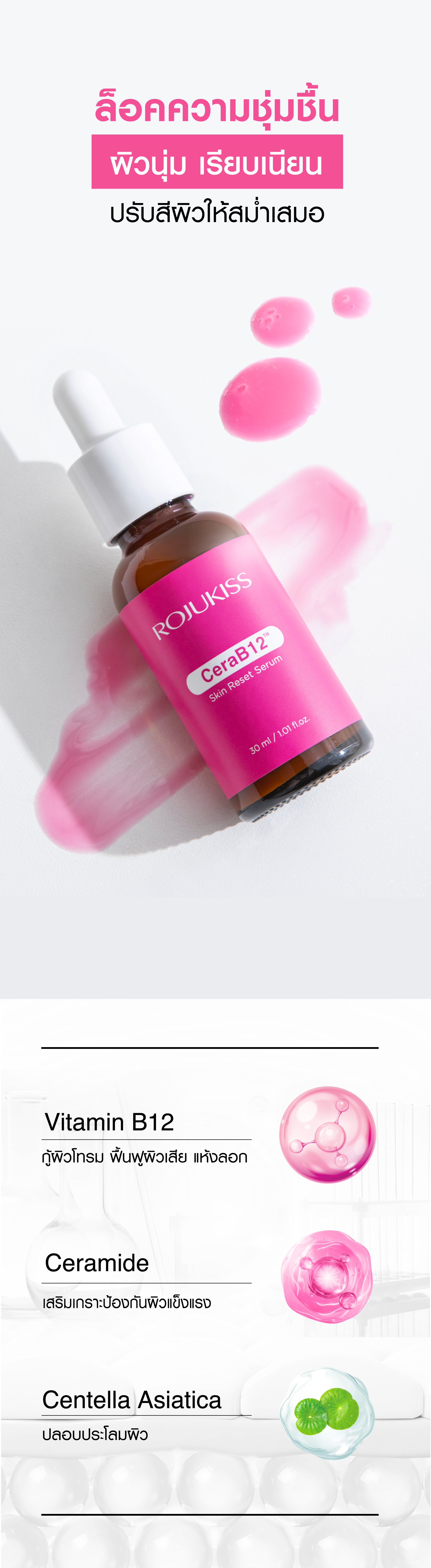 | ข้อมูลผลิตภัณฑ์ | เซรั่มเนื้อชมพูเข้มข้นจาก Vitamin B12 ผสาน Ceramides รีเซ็ตผิวพัง หมองโทรม เสริมเกราะป้องกันผิวแข็งแรง ให้ผิวกลับมาสดใส ลดความหมองคล้ำ ลดสิวอุดตันและรอยสิว พร้อม PGA ที่ช่วยสร้างฟิล์มบางๆบนผิว เพื่อกักเก็บน้ำและเพิ่มความชุ่มชื้นให้กับผิว |