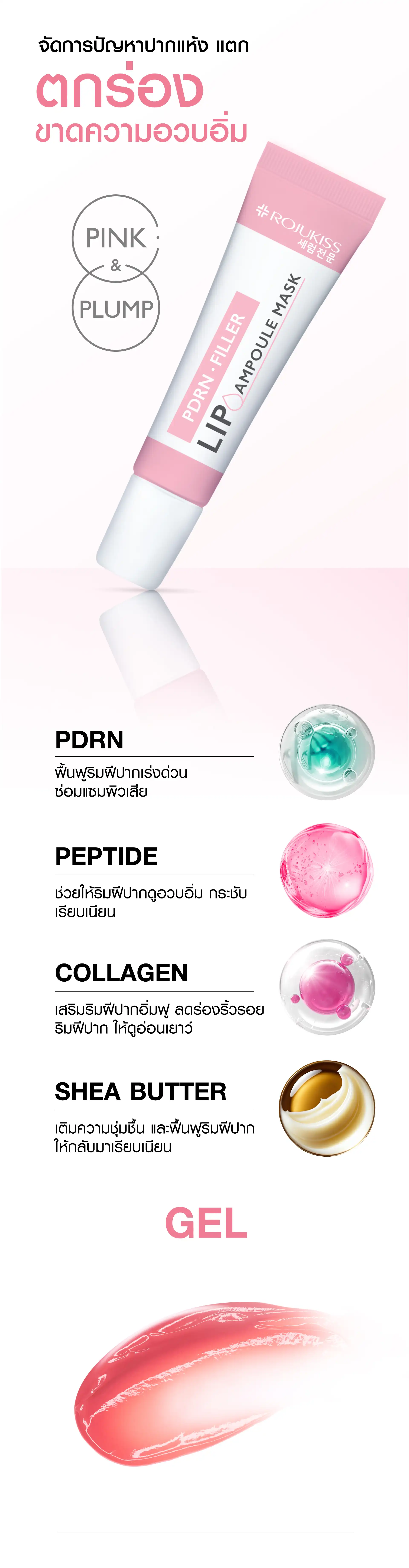 | ข้อมูลผลิตภัณฑ์ | Rojukiss PDRN Filler Lip Ampoule Mask Rojukiss Ceramide Hya Lip Treatment Ampoule Rojukiss Bright C Lip Ampoule Mask |