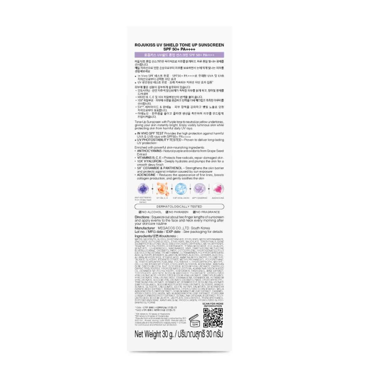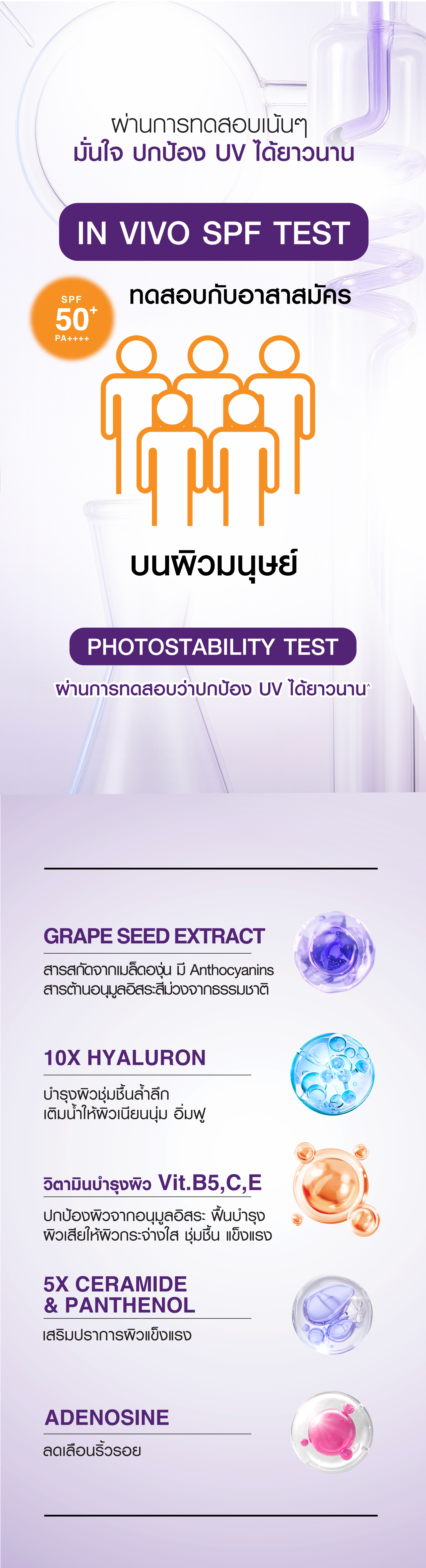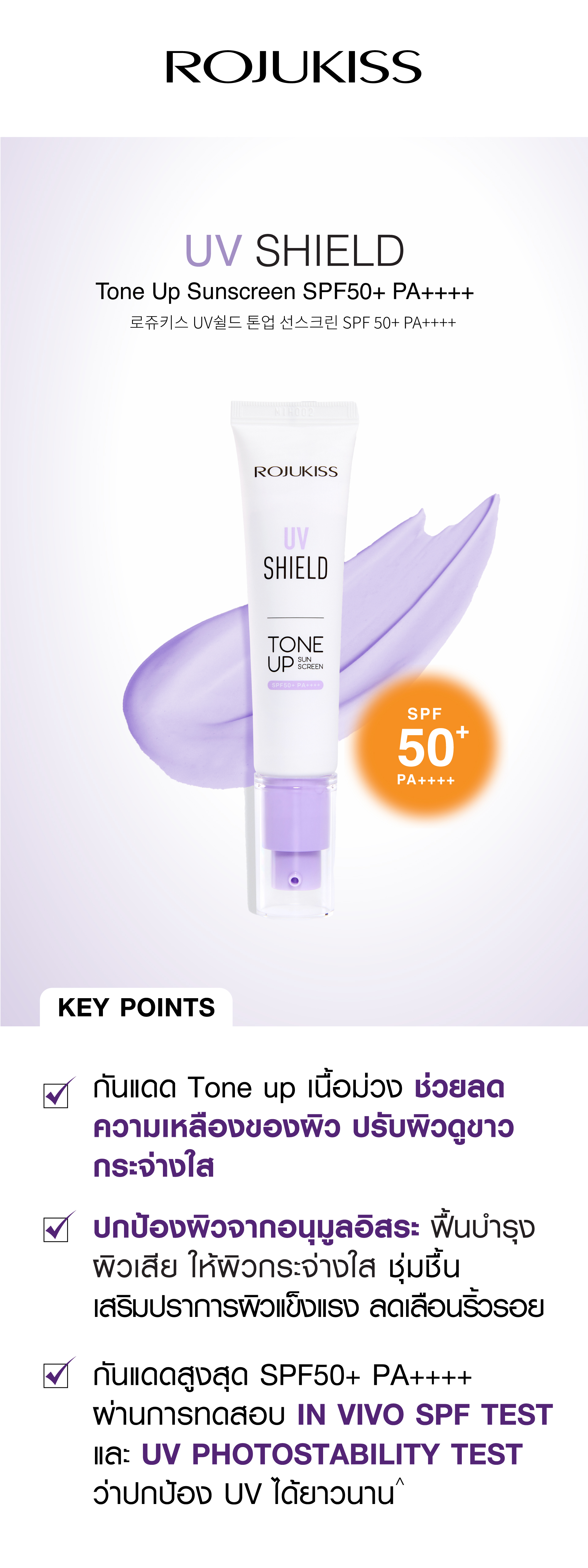 | ข้อมูลผลิตภัณฑ์ | กันแดด Tone up เนื้อม่วง ช่วยลดความเหลืองของผิว ปรับผิวให้ดูขาวกระจ่างใสขึ้นอย่างเป็นธรรมชาติ ผิวดูสว่างขึ้นทันที ผิวโกลว์ตลอดวัน พร้อมปกป้องผิวจากรังสี UV ที่ทำร้ายผิวในทุกๆวัน อุดมด้วยสารบำรุงผิวแบบจัดเต็ม *10X สื่อถึงสารไฮยาลูรอน 10 ชนิดในสูตร |