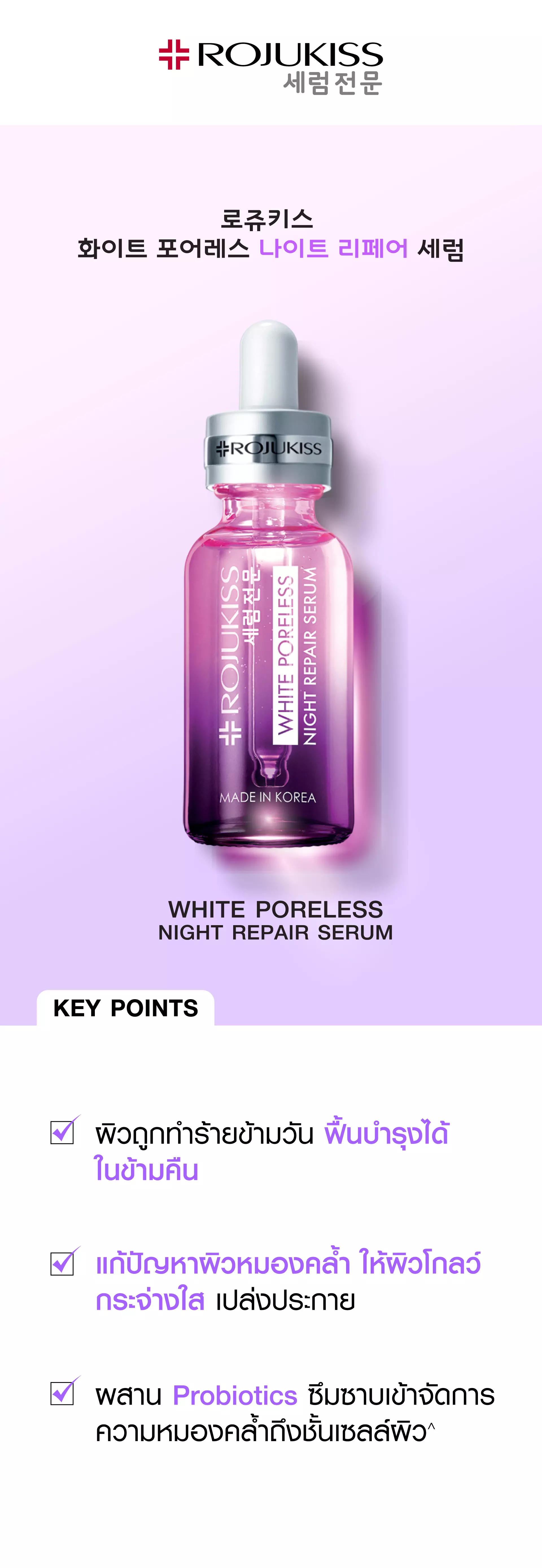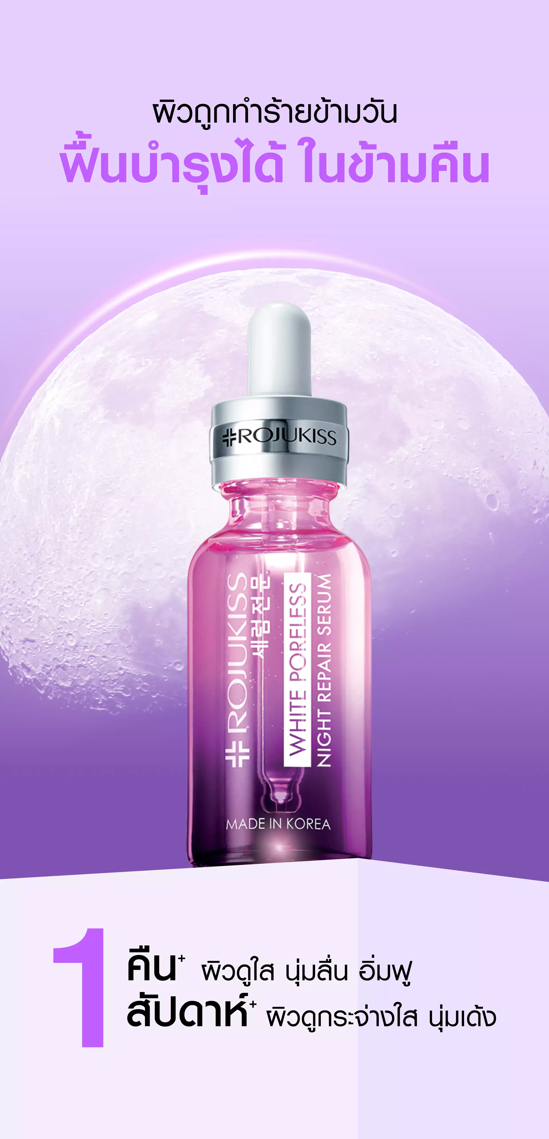 | ข้อมูลผลิตภัณฑ์ | ครั้งแรก^ เซรั่มบำรุงผิวเข้มข้นสูตรกลางคืน ช่วยฟื้นบำรุงแก้ปัญหาผิวหมองคล้ำ พร้อมปกป้องผิวจากการถูกทำร้ายในแต่ละวัน สู่มิติใหม่ของผิวโกลว์กระจ่างใส นุ่ม เรียบเนียน เปล่งประกายชั่วข้ามคืน ^ของโรจูคิส |