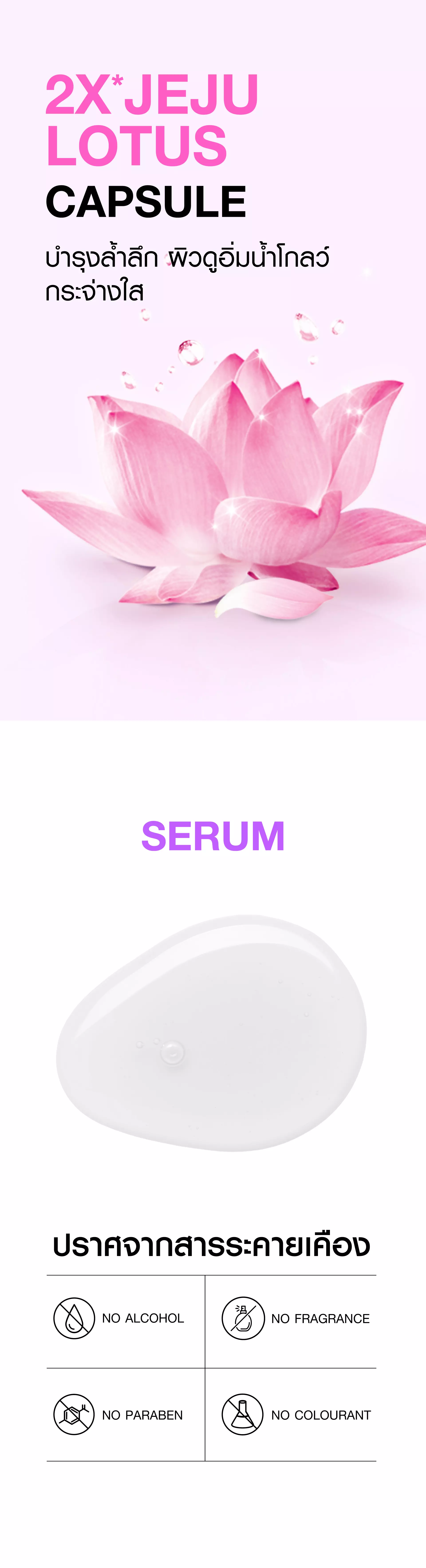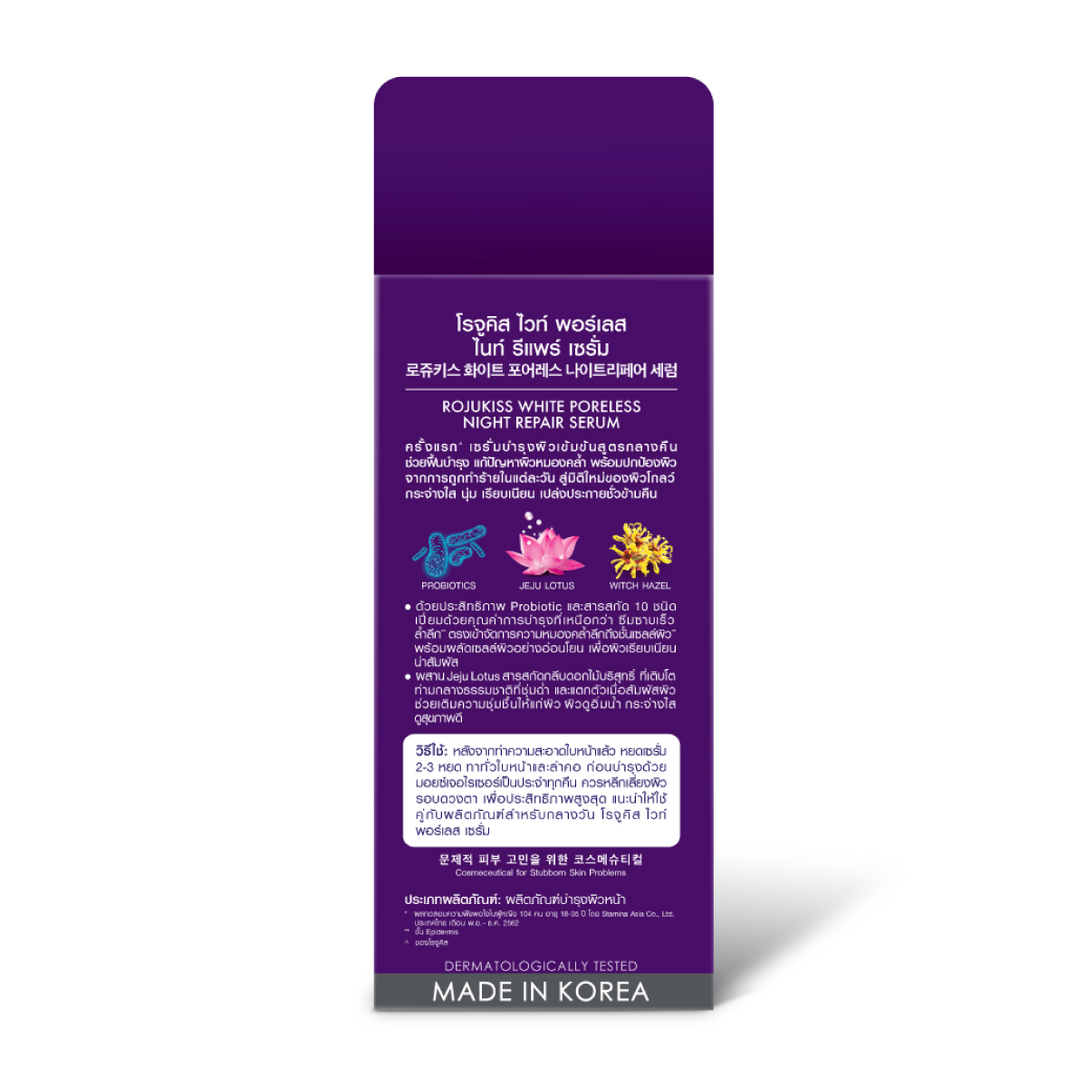 | วิธีใช้ | หลังจากทำความสะอาดใบหน้าแล้ว หยดเซรั่ม 2-3 หยด ทาทั่วใบหน้าและลำคอ ก่อนบำรุงด้วยมอยซ์เจอไรเซอร์เป็นประจำทุกคืน ควรหลีกเลี่ยงผิวรอบดวงตา |
